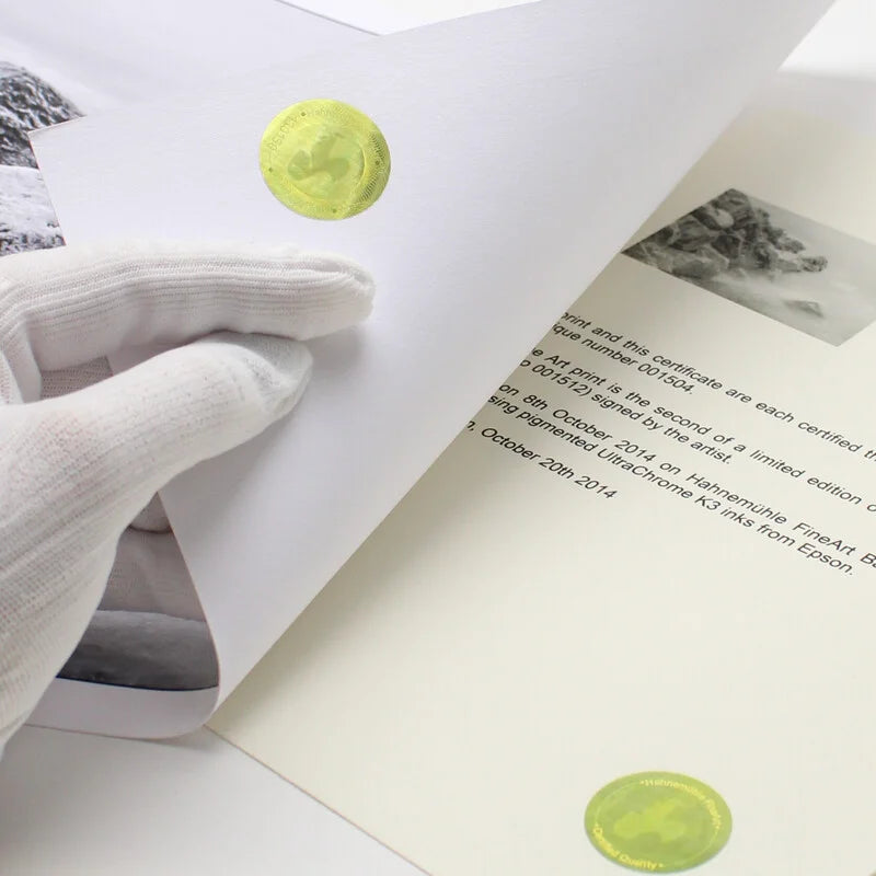 The Hahnemühle Certificate of Authenticity serves to guarantee the authenticity of artworks printed on Hahnemühle paper. This certificate, which must be signed by the artist, certifies that the work is original, numbered, and created using high-quality materials that meet museum standards. It is an important document for collectors and artists, as it increases the value of the work and ensures its provenance. Essentially, it is a form of guarantee that protects both the artist and the buyer. If you have any other questions on this topic, please don't hesitate to ask!